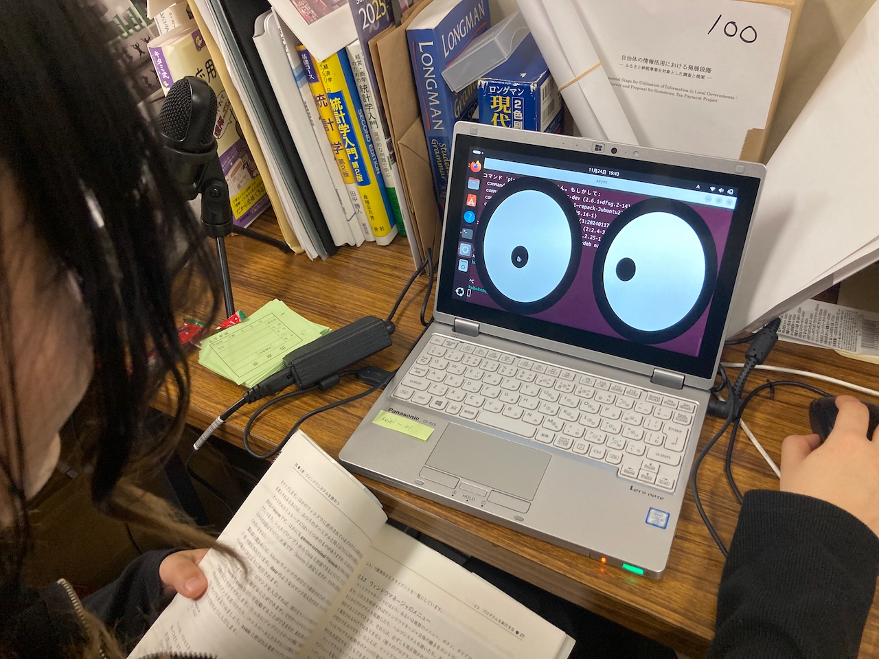 LinuxでX Windowを立ち上げて、xeyesをカワイイと仰ってます(笑)。